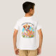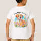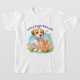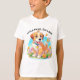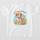Uma t-shirt com uma fotografia de um filhote fofo sentado entre as flores. Ele parece muito feliz por estar cercado por flores e borboletas. O presente perfeito para dar àqueles que amam cachorros. O slogan é "Pequenas patas, Grande Amor". Contém conteúdo generativo.
