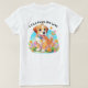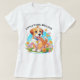 Uma t-shirt feminina com uma fotografia de um filhote fofo sentado entre as flores. Ele parece muito feliz por estar cercado por flores e borboletas. O presente perfeito para dar àqueles que amam cachorros. O slogan é "Pequenas patas, Grande Amor". Contém conteúdo generativo.