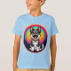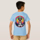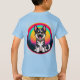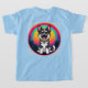 Ilustração de um animador cão animado sentado em frente a um fundo colorido do arco-íris, com um ambiente lúdico e cercado por uma paisagem serena de floresta, enfatizando alegria e arte vibrante.