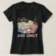 Um design tocador lúdico com uma pilha de livros aconchegante, uma xícara de café a vapor mantida por uma mão de esqueleto, e sotaques florais suaves. A frase "Café e Smut" é escrita em tons pastéis, misturando vibrações confortáveis com uma torção viscosa.