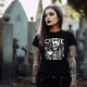 Café me faz uma camiseta mais agradável. © Desejos do Coração Escuro. Esta árvore gótica tem um esqueleto com uma xícara de café e as palavras "Café me torna mais agradável" nela.
