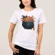 Caldeirão Da Camisa De Três Misturas E Gummies. Um boneco de caldeirão alegre, recheado de doces explodindo como confete, orgulhosamente esportando um chapéu de bruxa. Seu companheiro de vassoura se inclina perto, claramente à espera de um decolado carinhoso, o mais feliz movente de bruxas movido a açúcar do Halloween!