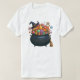 Caldeirão De Camiseta Giggles & Gummies. Um boneco de caldeirão alegre, recheado de doces explodindo como confete, orgulhosamente esportando um chapéu de bruxa. Seu companheiro de vassoura se inclina perto, claramente à espera de um decolado carinhoso, o mais feliz movente de bruxas movido a açúcar do Halloween!