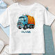 Esta camiseta personalizada apresenta um belo caminhão de lixo azul e amarelo.