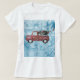 Camiseta caminhão de colheita vermelho sobre fundo azul com