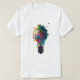 O design gráfico nesta camiseta apresenta um close-up de uma lâmpada com pintura colorida espalhando-a. O fundo é branco e as cores dominantes na imagem também são brancas. Há uma cor de sotaque de laranja escuro que pode ser vista em algumas gotículas de tinta. A própria lâmpada foi pintada com vários tons de azul, verde, amarelo, rosa e roxo. Algumas dessas cores foram misturadas para criar padrões e formas interessantes na superfície. A tinta parece estar pingando da parte superior da lâmpada em várias direções diferentes, criando um desenho abstrato quando cai sobre outras partes abaixo dela.