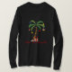 Camisa longa da luva das senhoras mostrada no preto com um impressão festivo da palmeira do feriado com texto de Mele Kalikimaka.