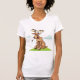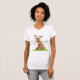 Este design é um alce de desenho animado. A alce está sentada sobre uma grama com um pedaço de grama na boca. Este design de alce de desenho mostra excelente nesta Camisa de T feminina
