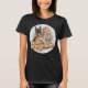 Camisa preta com German shepherd e mulher, gráfica em tema retrô/vintage.
