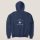 O capitão do veleiro personalizou a camisola náutica de capuz. Marinho azul com texto branco.