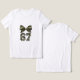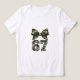 Both the bow and the number '67' are adorned with an authentic green, brown, and beige military-inspired camo texture, outlined with a clean white or beige edge for striking contrast. This flat vector style design is centered and print-ready, ensuring a high-quality, sharp image on any Zazzle t-shirt.