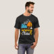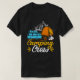 Esta camiseta preta apresenta um gráfico com tema de acampamento. Uma carrinha azul-clara com bagagem no topo está estacionada perto de uma tenda laranja. Uma pessoa está sentada ao lado de uma fogueira. Ao fundo, uma cordilheira esboçada é visível. O texto "Camping" é escrito em um script laranja estilizado sobre "Crew" em uma fonte branca e negrito com sotaques laranja e amarelo. Esta design celebra a camaradagem e aventura de acampar com amigos.