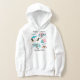 Um padrão super fofo com um tema de acampamento que inclui caravanas retrô, tendas, cadeiras de pavimento, guarda-sóis e mesas de piquenique em tons de azul-turquesa, rosa e branco,