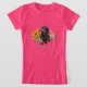 t-shirt feminina com desenho de cães dachshund. O "cachorro quente" preto está entre flores silvestres e girassóis, com o texto "Dachshund Love" embaixo. Personalize o texto ou exclua-o conforme desejar. Mostrado em um tee rosa brilhante, de manga curta.