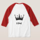 Texto Rei ou Nome ou Palavra com Imagem Coroa a Preto e Estilo é Camisa T Básica de 3/4 Capa Raglan. O tipo de cor é branco/vermelho.