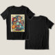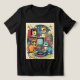 T-Shirt em ilustração química com quatro gatos brincalhões desfrutando de dispositivos retrorreflectores. Um gato senta-se ao lado de uma TV antiga, enquanto outro, vestindo óculos vermelhos, está empoleirado em pilhas de livros e discos. Um tocador de cassetes e giros evoca uma estética do século médio.