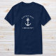 Camiseta azul marinho do capitão do navio, com tema náutico, apresentando uma ilustração branca de uma âncora clássica e o seu nome e o nome do seu barco em letras brancas modernas.