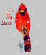 A graphic, art drawing, of a bright-red, Cardinal bird, with a seemingly, disgruntled expression, perches, on a branch, as snow falls, in the night-along with a familiar, Holiday phrase.