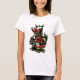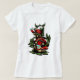 Essa imagem vibrante e caprichosa representa um grupo de cogumelos antropomórficos, aparentemente ganhando vida. A figura central é um cogumelo grande, ameaçador, com uma mão e dentes afiados. Cogumelos menores emergem do maior, criando uma cena surreal e perturbadora. Os cogumelos são cercados por espinheiros e folhas espinhosas, somando-se à atmosfera selvagem e indomada da imagem. A paleta de cores é uma combinação de vermelho, verde e preto, criando um contraste impressionante.