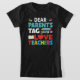 Deixe os pais saberem que a diversão na sala de aula é um esforço de equipe com nossos "Caros Pais, Tag You're It! Amor, design de Professores. Essa palestra lúdica e engajada destaca o espírito colaborativo entre professores e pais no apoio aos estudantes. Perfeito para professores que apreciam um pouco de humor e muito trabalho em equipe, esta camisa é uma maneira excelente de mostrar gratidão e promover uma comunidade escolar positiva