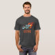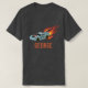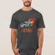 Esta design de camiseta moderna e legal apresenta um carro azul com rodas pretas e chamas quentes. A camisa pode ser personalizada com um nome e uma idade (ou qualquer outro número significativo).