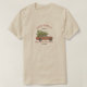 Ilustração de um vagão de suv vermelho em pano de madeira com árvore de Natal amarrada ao topo. Personalize o texto.