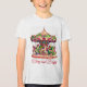 Crianças T-Shirt em um carrossel de Natal temido em listras de menta rosa e branca, acentuadas com verde, e a legenda "Feliz e Brilho"