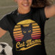 Uma silhueta de gato preto é apresentada contra um pôr do sol retrô estilizado, com as palavras Cat Mama escritas sob ela em uma fonte antiga. A design é perfeita para amantes de gatos que querem expressar seu amor pelos companheiros felinos.