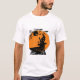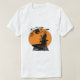 A design do Halloween apresenta a cena silenciosa negra de uma casa assombrada em uma colina com lua, nuvens, árvores e morcegos com o círculo laranja escuro