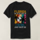 Uma cena colorida e nostálgica da praia da Flórida com um pôr do sol, palmeiras e ondas do oceano.