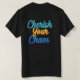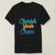 A design da camiseta apresenta a frase "Cherish Your Chaos" em letras negrito e multicoloridas. A natureza caótica da frase se reflete nas cores vibrantes, contrastantes e no arranjo dinâmico das letras. O design é atraente e encoraja o usuário a abraçar e apreciar os aspectos imprevisíveis e muitas vezes confusos da vida.