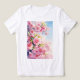 As flores deliciosas de cereja rosa estão em floração de cheio, rodeadas por folhas verdes escorridas contra um pano de fundo de um céu azul claro e nuvens brancas suaves. As pétalas caem suavemente, acrescentando uma sensação de movimento e tranquilidade à cena.