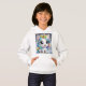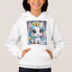 chibi, unicornio blanco de ojos claros y cuerno de oro brillante, y melena en tonos degradados de colores del arcoíris; fondo de cielo gris, mirando hacia arriba, diseño tipo póster 8k y en tono cielo azul.