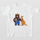 The bear is wearing a blue jumpsuit, holding a koala in one hand and placing his other hand on the kangaroo's shoulder.