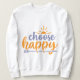 This design features the uplifting quote “choose happy” in a cheerful and eye-catching graphic style. The word “choose” is written in purple, while “happy” is in a warm orange tone. Above “choose” is an illustration of a rising sun in orange, symbolizing a bright and hopeful beginning. Below “happy” is a purple arrow graphic, pointing forward as if guiding positive energy ahead. The overall composition conveys a message of consciously choosing happiness.