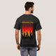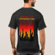 " Nosso deus é um fogo de consumo…" Este t-shirt preto carrega estas palavras e uma imagem de uma skyline da cidade mostrada em silhueta contra o fulgor do fogo com os embers ardentes que chovem para baixo na cidade.