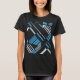 Uma design geométrica abstrato, artística e impressionante, é criada nessa combinação de formas e linhas são vários tons de branco, cinza de luz e azul médio. Foto aqui em uma t-shirt preta, mas também disponível em vários estilos e cores. Inspirado no estilo artístico nativo americano/sudoeste (com alguma influência moderna do século Médio), o design projeta uma qualidade artística vibrante e inovadora para uma adição versátil e moderna ao seu visto casual e diário (seja em casa, socializando com amigos, praticando esportes ou correndo sobre a cidade). A design de camisa como "arte 'vestível'" também expressa um sentido de seu estilo individualizado, contribuindo para o sentimento de ser "unido" e criativo em suas escolhas pessoais de guarda-roupa.