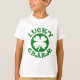 Emblema verde e branco do círculo com encanto afortunado no texto redondo circular. Trevo do trevo de quatro folhas para a sorte do irlandês! © www.CuteComfy.com de Copyright