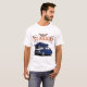 Esta é uma renderização de um carro músico clássico americano azul com gráficos de estilo vintage no fundo para um olhar retrô.