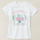 Esta camiseta de picleball tem uma imagem de arte rosa e verde de pás de picleball e um vidro martini cercado por galhos de louros com a frase "Clube de Cocktail de Pickleball, Por Favor, Dink Responsável." As cores utilizadas incluem verde e rosa.