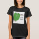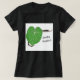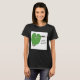 Uma camiseta feminina com um impressão de cobra único. Ele apresenta uma cobra animada caçando em uma grande folha verde. O cobra tem manchas pretas irregulares que acrescentam exclusividade e poder místico ao design. A camiseta inclui o texto: "Caçador de Cobra."