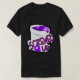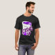 Um design de camiseta inspirado em roupa de rua com gráficos coloridos e negros e texto referenciando termos populares de gírias associados ao abuso de xarope de tosse.