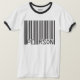 A mensagem secreta nesta camisa é que muitas pessoas estão compradas facilmente com dinheiro. Explica o código de barras.