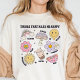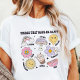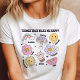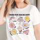 Celebre as alegrias simples da vida com nossa camisa "Coisas que me fazem feliz". Este design encantador mostra ilustrações bonitinhas de arco-íris, natureza, sorrisos, paz, flores, sol, café e comida, lembrando as pequenas coisas que trazem felicidade. Perfeito para espalhar vibrações positivas e abraçar uma perspectiva alegre.