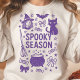 Esta camisola branca é perfeita para celebrar a estação assustadora. O design de estilo rabisco apresenta ilustrações desenhadas à mão de arcos coquetes, doces, bruxas, gatos, morcegos, caldeirão e muito mais, ao redor da frase festiva "Estação Spooky". É uma forma excelente de celebrar o Halloween nesta temporada.