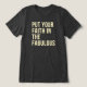 Abraça sua faísca interior com esta camiseta 'Coloque sua fé na fabulosa'! Apresentando uma letra chic, dourada-amarela, que chama a atenção, esta t-shirt é armada com um padrão de starburst, refletindo a confiança e o otimismo. Imagem perfeita para aqueles que acreditam em viver a sua melhor e mais bela vida. Ideal para visto diário ou uma noite fora. É um presente de excelente para um amigo que adora brilhar!