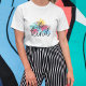 Esta camiseta fofinha apresenta um coração balançoso e uma tinta colorida em tons de azul, amarelo, rosa e verde junto com textos de tendência que dizem: seja gentil.