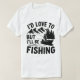 Esta roupa branca apresenta uma ilustração da silhueta de uma pessoa que pesca de um barco num lago, com montanhas e árvores ao fundo. O texto diz "EU ADORARIA, MAS EU ESTAREI PESCANDO". É uma design humorística para os entusiastas da pesca que podem usar seu hobby como desculpa educada.