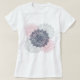 Camiseta com ilustração gráfica de mandalas azul escuro, rosa e cinza.