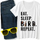 Pássaros, observadores de pássaros, ornitólogos e amantes da natureza amarão esta camiseta macia e tamanho celebrando seu passatempo favorito com o ditado "Coma. Durma. Pássaro. Repita." Quer sejam hobbistas que apreciem os pássaros em seus quintais, ou um fotógrafo de vida selvagem sério que adora documentar as vidas interessantes desses belos passarinhos, eles vão amar as pássaros bonitinhos espiando pelas cartas na frente. Um cardeal vermelho brilhante, uma pomba macia, um pica-pau descendente adorável, e um pica-pau azul impressionante fazem a sua aparência nesta camisa, tal como frequentemente gostam de visitar os nossos pátios! No verso, o ditado é repetido, e você pode escolher mantê-lo ou personalizar o texto com o nome do seu passarinho favorito, um clube de pássaros ao qual pertence, ou outro passarinho divertido dizendo que você ama. Também no verso, você encontrará uma foto de cheio de uma pomba dopadora! Adorei pássaros há anos, e gosto de fotografar os visitantes dos meus alimentadores de quintal, assim como outros que encontro em parques locais. Espero que goste desta design! Fotos e design por Amanda Renee, Designs digitais CtrlZ